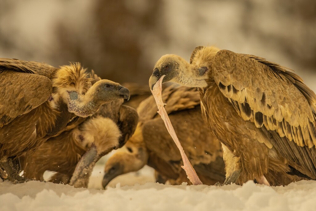 Sępy krążą nad nami. Ale z bliska, a nawet z bardzo bliska, zobaczę je za tydzień, kiedy po ciemku będziemy się wspinać do innej czatowni. O chłodzie i głodzie przesiedzimy kilka godzin, by potem zdecydować się na jeszcze jeden desperacki krok: poczekać na ptaki do końca. Brak ciepłej herbaty zostanie wynagrodzony. Usłyszymy bowiem odgłosy przyprawiające o dreszcze na skórze. Zobaczymy też prawdziwą jatkę – nalot trzydziestu potężnych osobników i walkę o kości przyobleczone w tkanki miękkie. Z bliska rozpoznamy pary i układ hierarchiczny luźnego stada. Ale to będzie za tydzień.