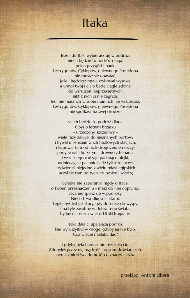W poezji Kawafisa Itaka to nie tylko wyspa na mapie czy punkt geograficzny, ale duchowy kompas. To światło świecące u kresu długiej podróży, którego nie można dotknąć, bo jego moc tkwi w przewodzeniu, a nie w tym, że daje się posiąść. Kawafis mówi nam, że Itaka żyje w każdym człowieku: w jego pragnieniach, błędach i tęsknocie za czymś większym niż codzienność. Podróż powinna być piękna nie dlatego, że prowadzi nas do celu, ale dlatego, że uczy nas widzieć: widzieć morskie fale, widzieć ludzkie gesty, widzieć własną samotność, widzieć odwagę codziennych wyborów.