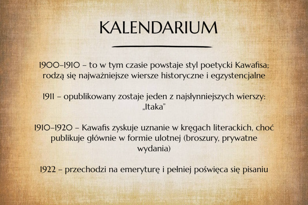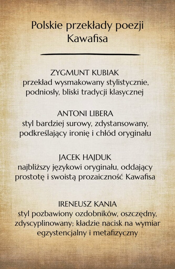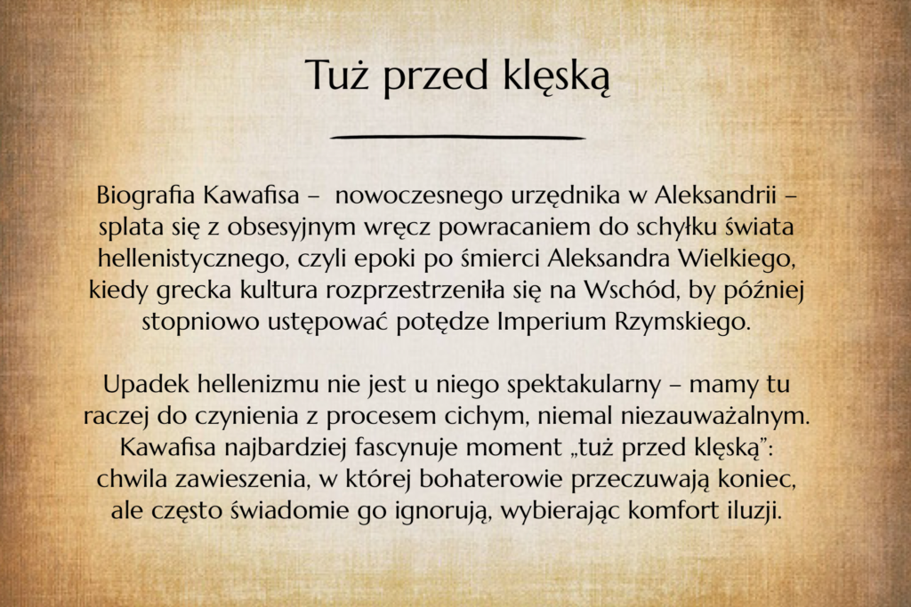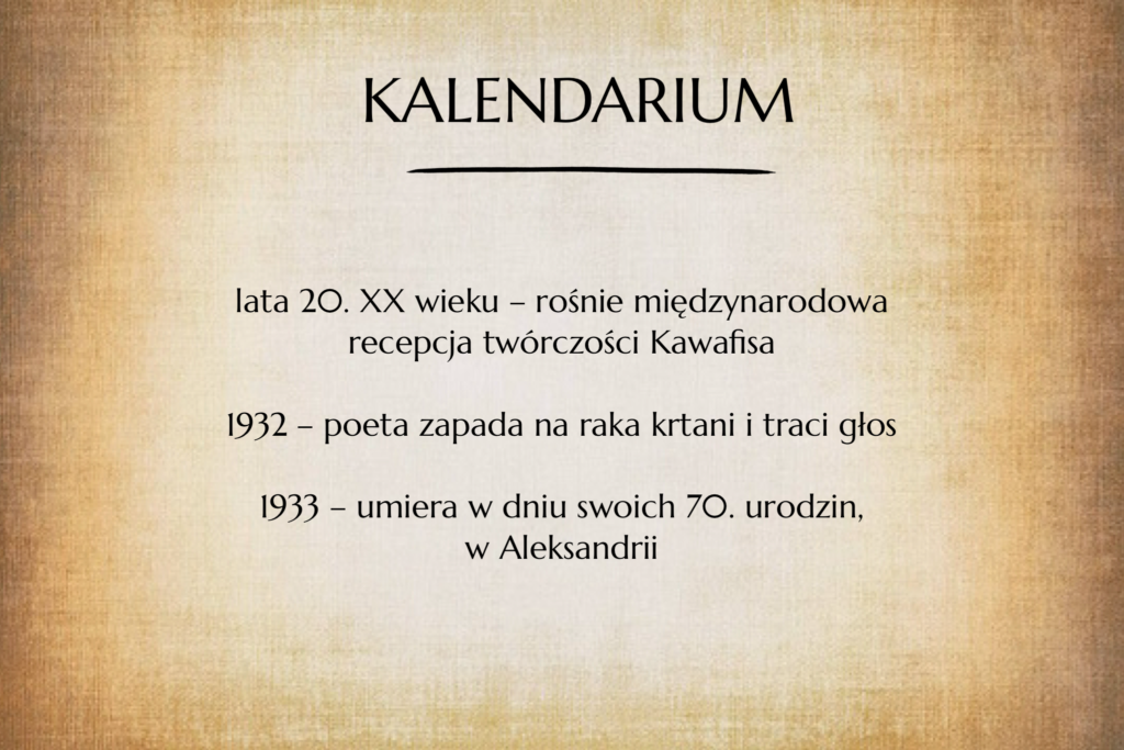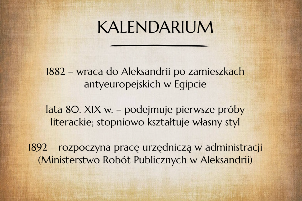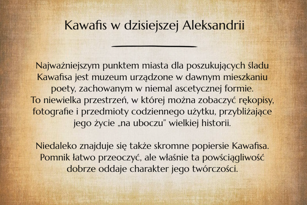 Myśląc o nim, wyobrażamy sobie człowieka pochylającego się nad miastem przypominającym palimpsest: Aleksandrią, pełną cieni i świateł, bogów i kupców, filozofów i zwykłych ludzi. Poetę żyjącego skromnie, z dala od salonów literackich, a jednak tak głęboko zanurzonego w majestacie starożytności, że jej blask odbija się na jego twarzy. Jego biografia to nie tylko opowieść o życiu, ale także o poszukiwaniu tożsamości, dialogu z przeszłością i nieustannym pytaniu: kim jestem w obliczu nieskończonej historii?