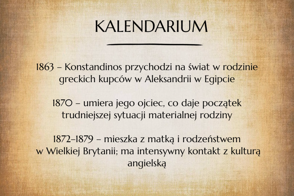 Konstandinos urodził się w greckiej rodzinie w Aleksandrii, mieście samym w sobie będącym metaforą przemijania, tak różnorodnym jak mozaika hellenistycznych pałaców, i dorastał w świecie nieustannych przemian. Dom rodzinny, wypełniony głosami greckich kupców, zapachem przypraw i wspomnieniami chwalebnej przeszłości Egiptu, był miejscem ciepłym, lecz kruchym. Zbyt kruchym, by stanowić fundament, zbyt zmiennym, by dawać poczucie trwałości.