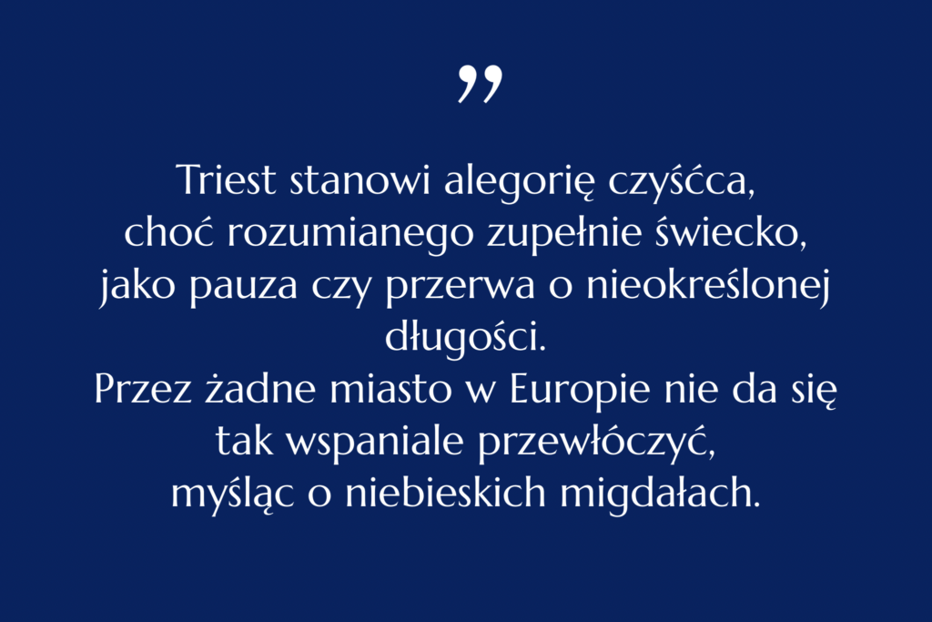 Być może to właśnie to ostatnie zdanie najlepiej oddaje stosunek autorki do Triestu; z pewnością najtrafniej ubiera w słowa moje odczucia. Dla mnie Triest jest bowiem bardziej wszędzie niż nigdzie, bardziej łączący niż dzielący, rzeczywiście pełen melancholii, a jednocześnie pełen nadziei i pogody mimo wszystko. Chyba zresztą nie może być inaczej: tam, gdzie do swego kresu dochodzi jedna cywilizacja, zaczyna się przecież druga, a koniec staje się początkiem nowego. Stojąc na głównym placu miasta, Piazza Unità d’Italia, w moich wspomnieniach zawsze wypełnionym słońcem, eleganckie habsburskie budynki zostawiamy za plecami – jak podporę i korzenie, od których się nie ucieka. Przed sobą mamy jednak morze i przyszłość, otwierając szeroko ramiona na świat.