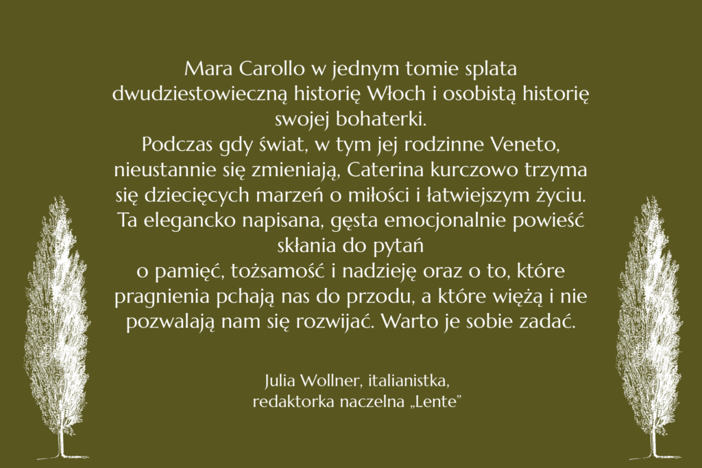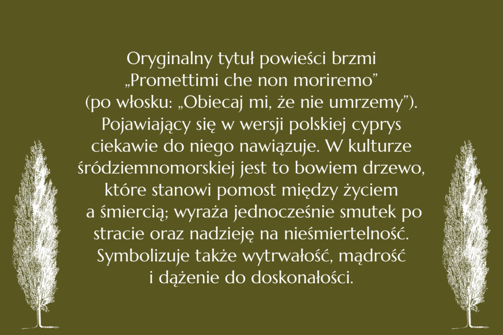 Prawidłowość tę ciekawie ukazała Mara Carollo, włoska pisarka, która na rodzimym rynku wydawniczym zadebiutowała w 2025 roku powieścią Promettimi che non moriremo. Jej polskie tłumaczenie, które zawdzięczamy Agacie Pryciak, ukazało się właśnie nakładem wydawnictwa Książnica pod tytułem W cieniu starych cyprysów.